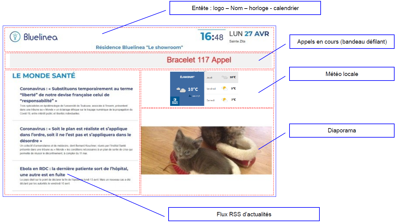 Un écran de convivialité, aussi appelé tableau de bord en regard des informations qu’il peut contenir, est une page d’informations dynamiques destinée à être affichée sur un afficheur LCD, typiquement un moniteur TV mural. Tout équipement intégrant un navigateur internet est cependant capable d’afficher ces contenus. Chaque écran peut contenir plusieurs zones qui affichent un contenu distinct. Une zone de contenu correspond à un contenu HTML local (récupéré au niveau du BlueHub) ou provenant d’un site Web. Serenea inclut un certain nombre de modules prédéfinis d’accès à du contenu :