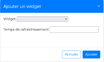Choisissez le type de widget à afficher ainsi que le temps de rafraichissement (intervalle réactualisation des données affichées) en secondes. En fonction du type de widget, des paramètres supplémentaires peuvent être demandés.