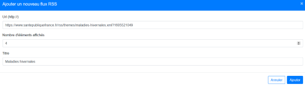 Sélectionnez dans la liste le thème que vous souhaitez afficher, et notez son url. Pour les maladies hivernales : https://www.santepubliquefrance.fr/rss/themes/maladies-hivernales.xml?1605521049