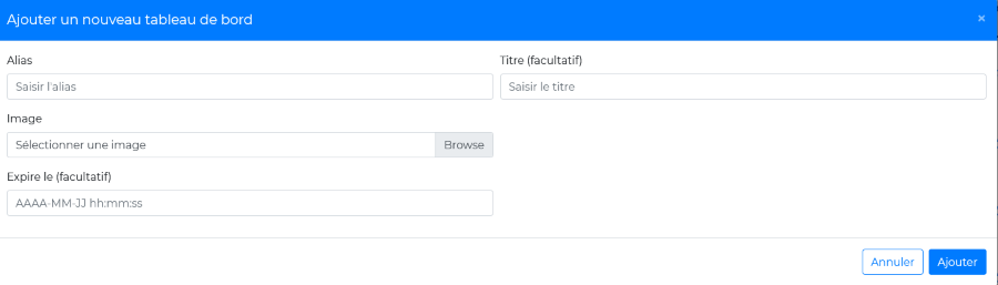 Un tableau de bord est d’abord défini par un alias. Il s’agit du nom qui sera utilisé pour accéder à son contenu.