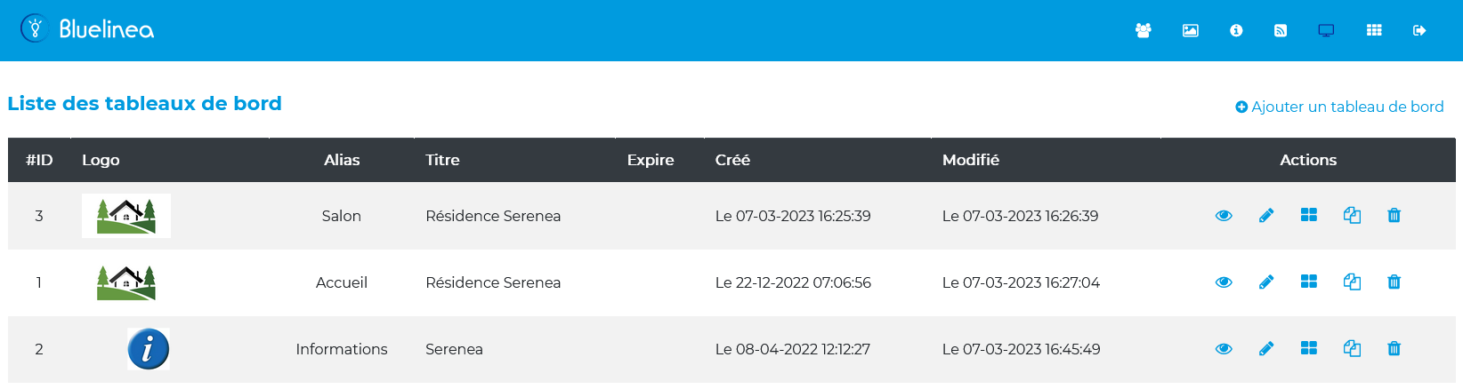 Les icônes de la colonne “Actions” permettent d’interagir avec ces écrans.
